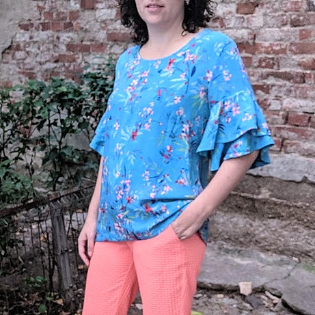 The second pair of pants done in a vivid neon salmon color with waffle texture is a bit larger as the fabric was more stiff and no stretch. They feel quite great. The top is a floral cotton batiste. Very very light fabric. Maybe a bit too light for this top. I did it very slightly larger and fixed the neckline and the dart. The neckline and the ruffles on the sleeves are finished with self bias fabric. Love this finishing. Both tops are longer then the pattern.The pink pants fabric is from this summer. I only did one "fabric shopping trip" and bought 5 or 6 fabric and happy to say that 3 of them are already sewn. The other 3 fabrics ( the blues ) are from last summer crop. Feels like my stash is going just a little bit down but I still have so many fabric ... I need to find some way to donate some and be a bit more picky when I buy!